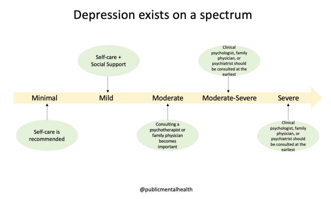 It is for clinical purposes that depression has been categorized as above, and to determine if medical intervention is needed. In practice, however, depression can be best defined by its level of severity based on the symptoms, their duration, and the extent to which they are disabling. There are many tools and questionnaires through which the severity of depression can be measured. Patient Health Questionnaire or commonly known as PHQ-9 is one such tool for self-assessment of depression through which the severity of depression can be determined. It consists of 9 questions that ask you to rate your symptoms on a scale of 0–3. The questionnaire takes less than 3 minutes to complete, and the resulting score based on the responses can range anywhere between 0–27, giving a preliminary estimate of the severity of depression. The severity can be minimal, mild, moderate, moderately severe, and severe.